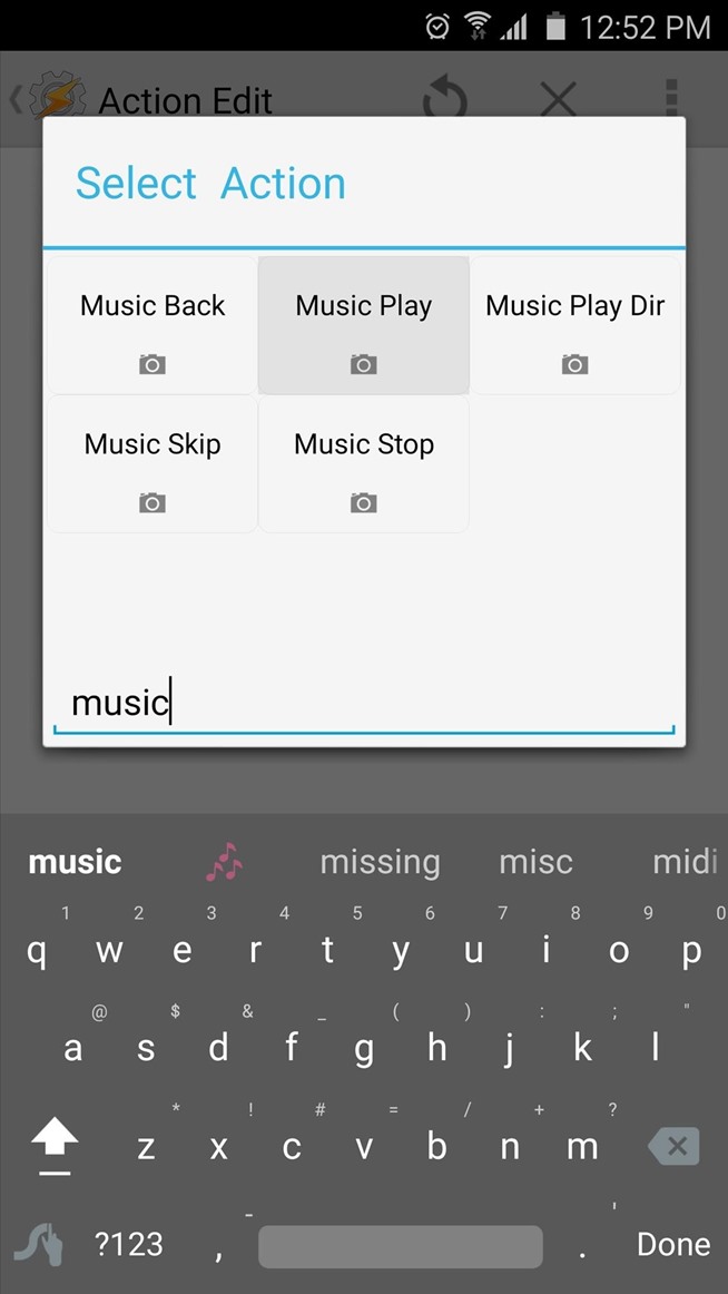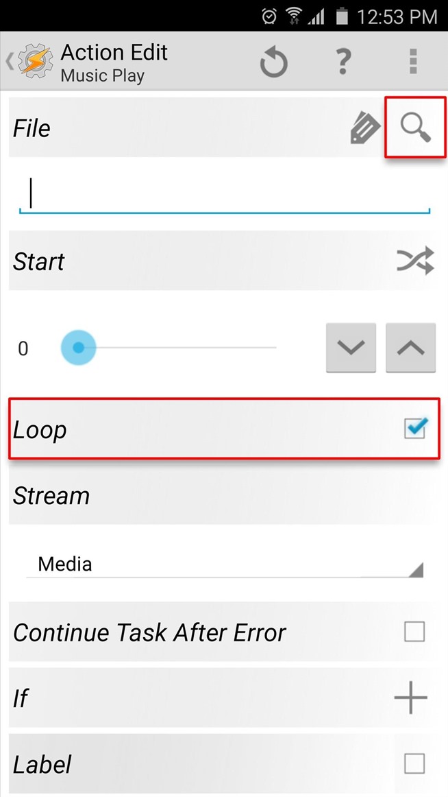 Dari sini, ketik “musik” ke Filter lapangan di bawah popup, kemudian pilih “Music Play” tindakan. Berikutnya, pastikan “loop” pilihan dicentang, lalu ketuk ikon pencarian di dekat sudut kanan atas layar. Dari sini, menggunakan menu berikutnya untuk menelisik dan pilih file musik yang Anda ingin bermain ketika Anda berada di layar awal, lalu tekan tombol kembali perangkat Anda dua kali.
