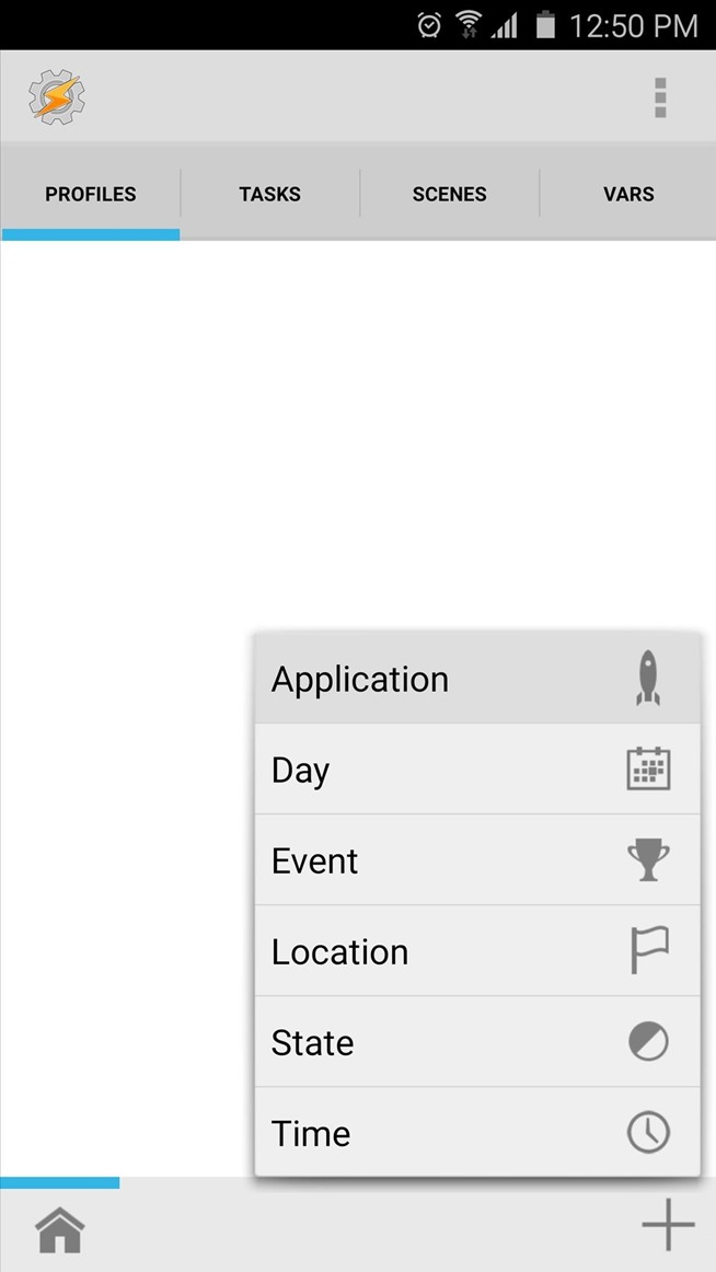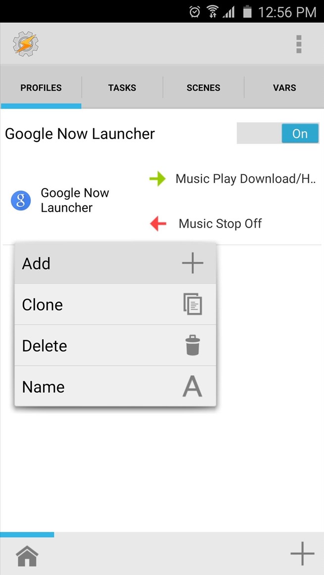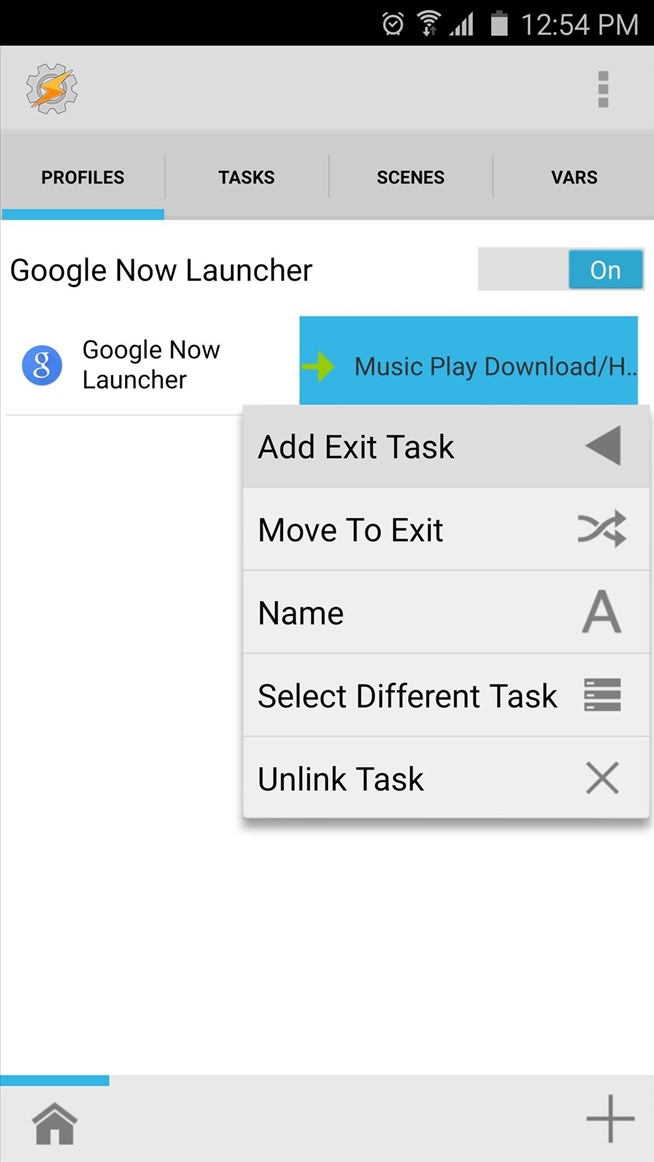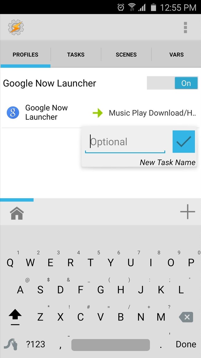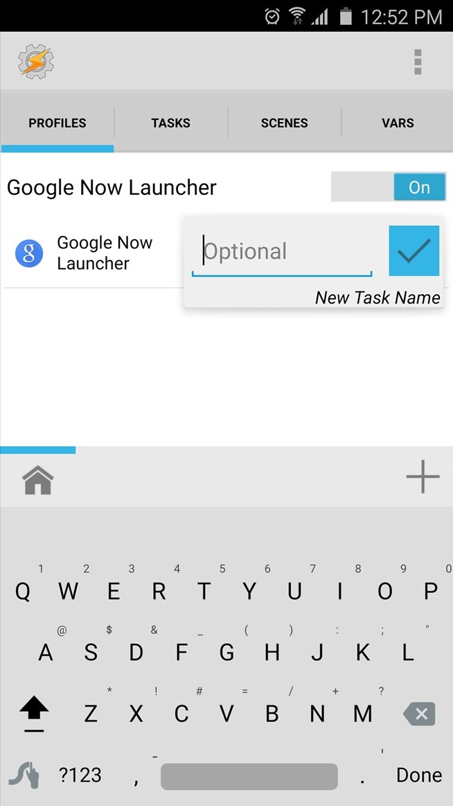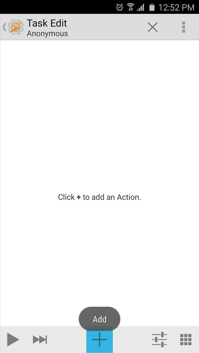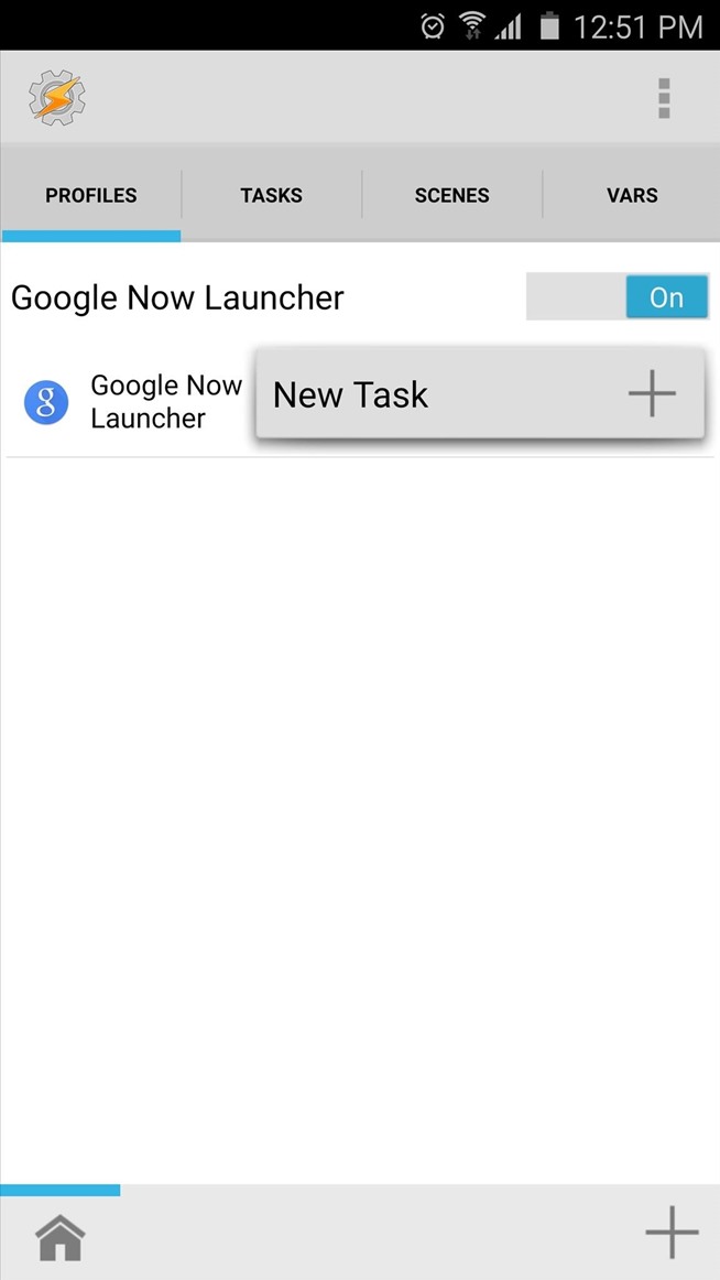 Setelah Anda memilih peluncur Anda sebagai konteks untuk profil Anda, tekan tombol kembali perangkat Anda sekali. Pada titik ini, Anda akan diminta untuk mengasosiasikan tugas dengan profil baru Anda. Tekan “New Task” di sini, maka cukup tekan tanda centang ketika diminta untuk nama tugas Anda. Pada bagian bawah layar berikutnya, tekan + tombol untuk menambahkan tindakan untuk tugas Anda.