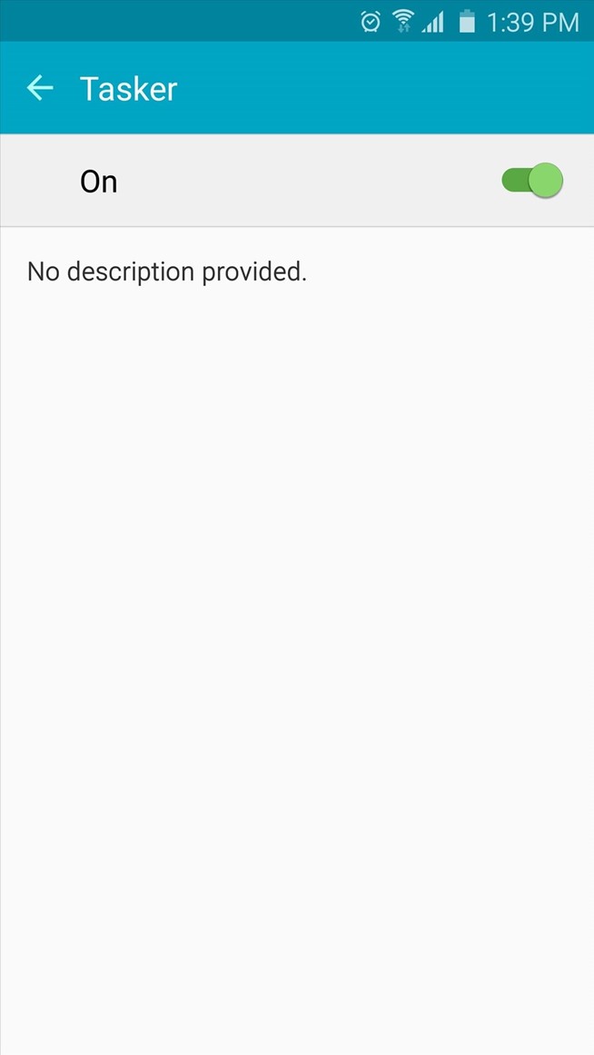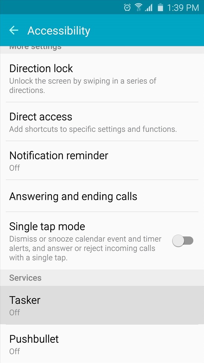 Setelah Anda punya Tasker diinstal, Anda juga harus memastikan aksesibilitas plug-in diaktifkan. Jika Anda tidak yakin tentang hal ini, kepala ke menu Settings utama ponsel Anda, kemudian pilih Accessibility. Dari sini, pilih Tasker opsi dari daftar, maka pastikan plug-in diaktifkan dengan menggunakan toggle switch di bagian atas layar.