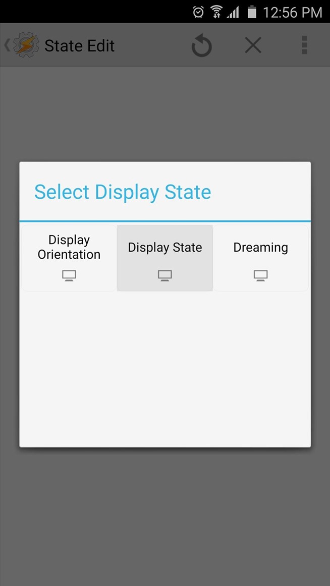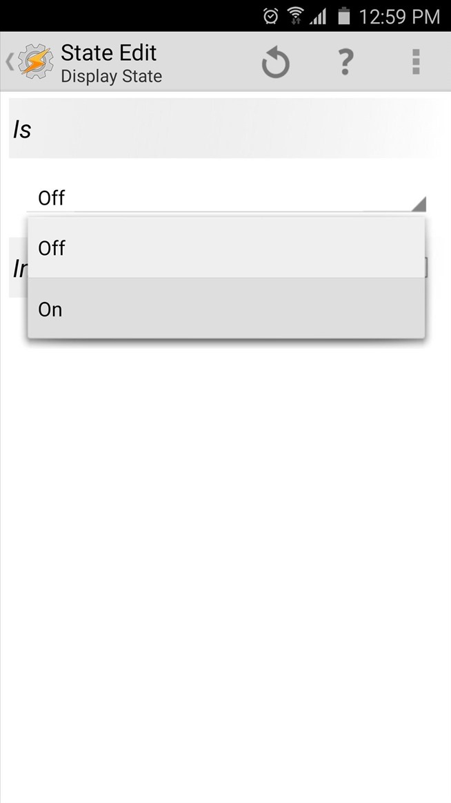 Pada dua menu berikut, pilih “Display,” dan kemudian “Tampilan Negara.”Dari sini, gunakan menu drop-down di bawah Is kategori untuk menentukan bahwa profil ini tidak boleh menjalankan kecuali layar Anda adalah “On.”