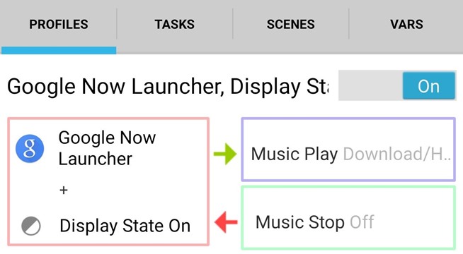 Profil (merah): Hanya aktif saat peluncur & tampilan keduanya aktif; Tugas (biru): Memainkan musik ketika profil aktif; Keluar Tugas (hijau): Menghentikan musik ketika profil tidak aktif