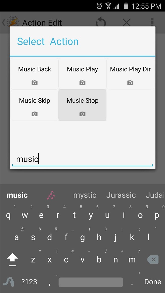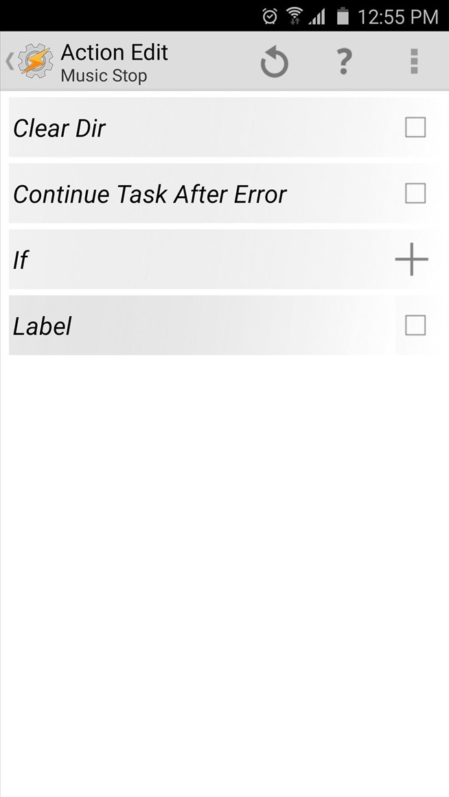 Berikutnya, menambahkan tindakan untuk tugas keluar dengan menekan +tombol di bagian bawah layar. Dari sini, ketik “musik” ke Filter bidang lagi, tapi kali ini memilih “Music Stop.” Pada menu berikut, meninggalkan semua opsi terpilih, kemudian tekan tombol kembali perangkat Anda dua kali.