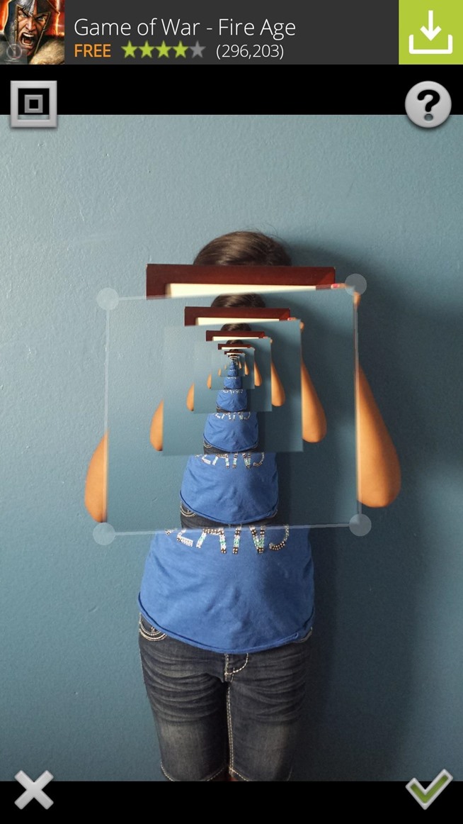 Mengatur titik fokus dari efek Droste dengan menekan di dalam jendela, dan menyesuaikan intensitas efek dengan gerakan mencubit. Setelah selesai, hanya tekan tanda centang.