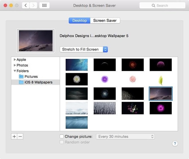 Setelah unzip file, Anda dapat menyimpan semua dari mereka dalam folder pada desktop Anda (atau di mana pun), kemudian pergi ke System Preferences -> Desktop & Screen Saver -> Desktop untuk memilih latar belakang Anda dari pilihan yang muncul di sebelah kiri. Jika Anda tidak melihat folder Anda, Anda dapat mengklik tanda + untuk menambahkannya ke dalam daftar.