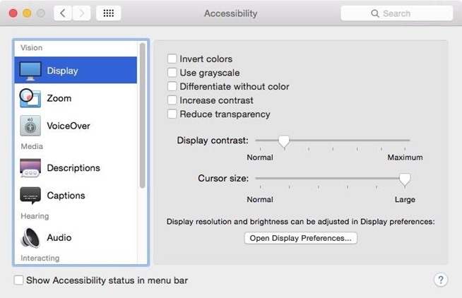 Langkah ini melibatkan peningkatan kontras layar dengan pergi ke System Preferences -> Accessibility -> Display, kemudian menempatkan “Tampilan kontras” kursor pada tanda hash kedua. Hal ini akan meningkatkan warna dan membuatnya tampak lebih seperti layar IPS pada iPhone.
