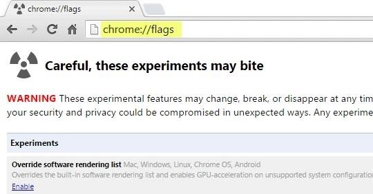 Pertama, Anda harus menuju ke menu pengaturan eksperimental tersembunyi Chrome.Jadi ketik chrome://flags ke address bar Anda, lalu tekan Enter.