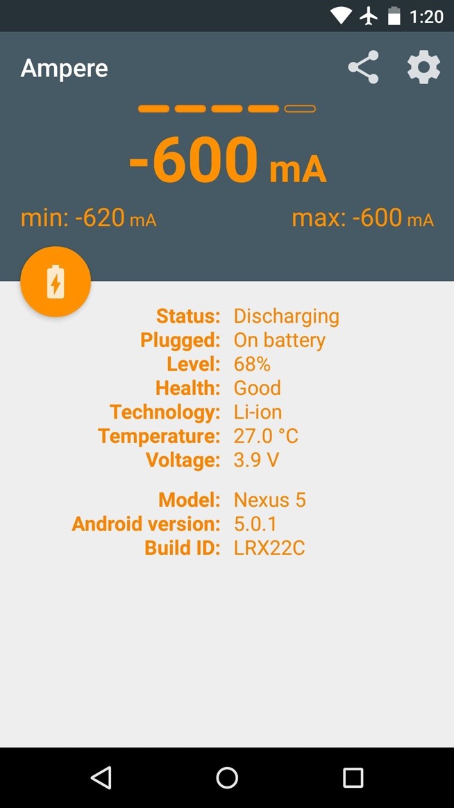 Bandingkan angka ini dengan pengukuran yang Anda terima dari Ampere ketika Anda menghubungkan charger Anda. Jangan lupa untuk faktor dalam tingkat telepon itu pemakaian, meskipun. Sebagai contoh, jika tes awal ditampilkan tingkat debit dari -200 mA, tambahkan 200 mA untuk pengukuran Anda menerima untuk charger Anda dan membandingkan total output terdaftar charger Anda. Fluktuasi ~ 100 mA yang diharapkan, tapi apa pun masa lalu yang bisa berarti Anda memiliki charger rusak atau kabel.