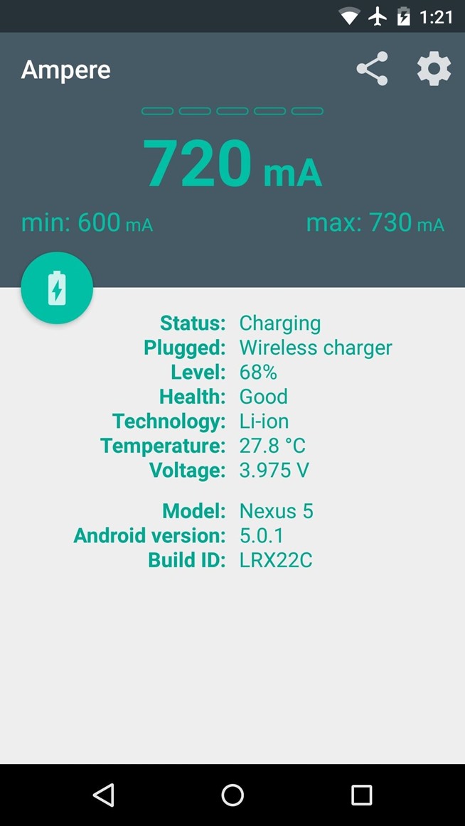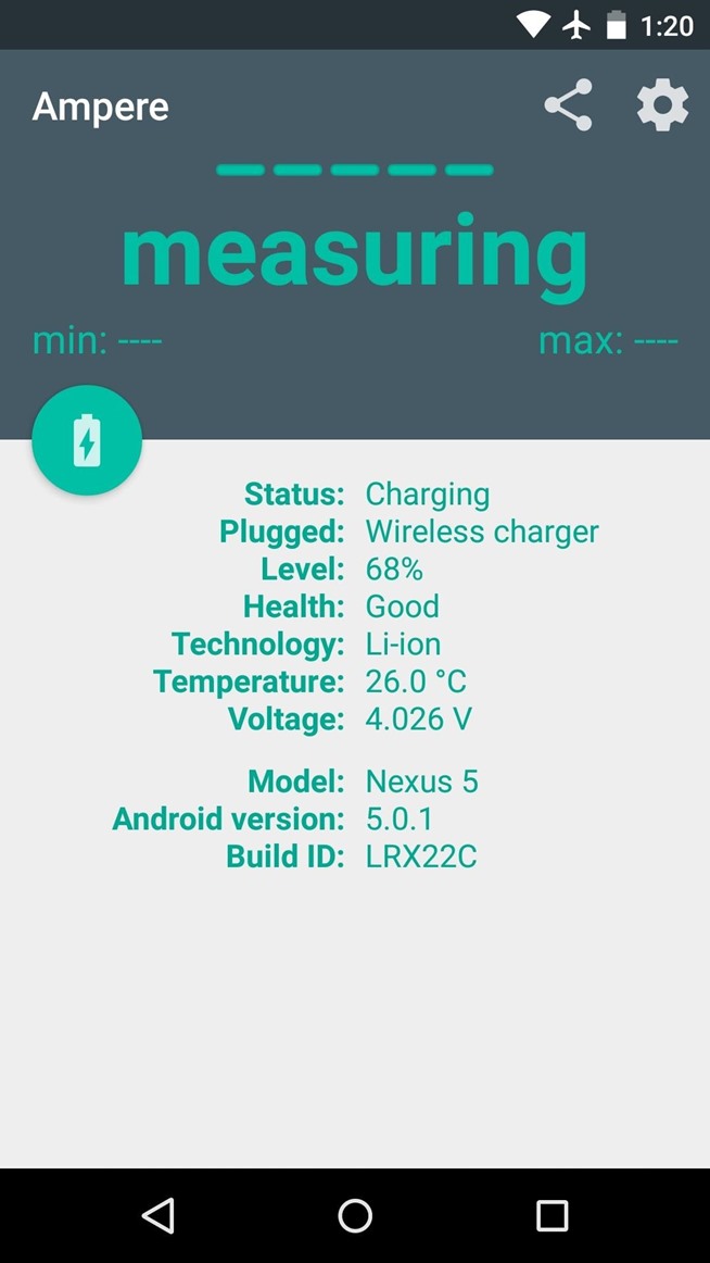 Ketika Anda pertama kali memulai Ampere, aplikasi akan melakukan kalibrasi selama 5 sampai 10 detik. Memungkinkan tes awal ini berjalan tanpa menghubungkan ponsel Anda ke pengisi daya, maka Anda akan melihat hasil imbang baterai saat perangkat Anda ditampilkan sebagai ampere negatif. Catat nomor ini, karena tingkat di mana ponsel Anda menggambar saat ini tidak faktor dalam pengukuran Anda akan menerima ketika menguji charger Anda.